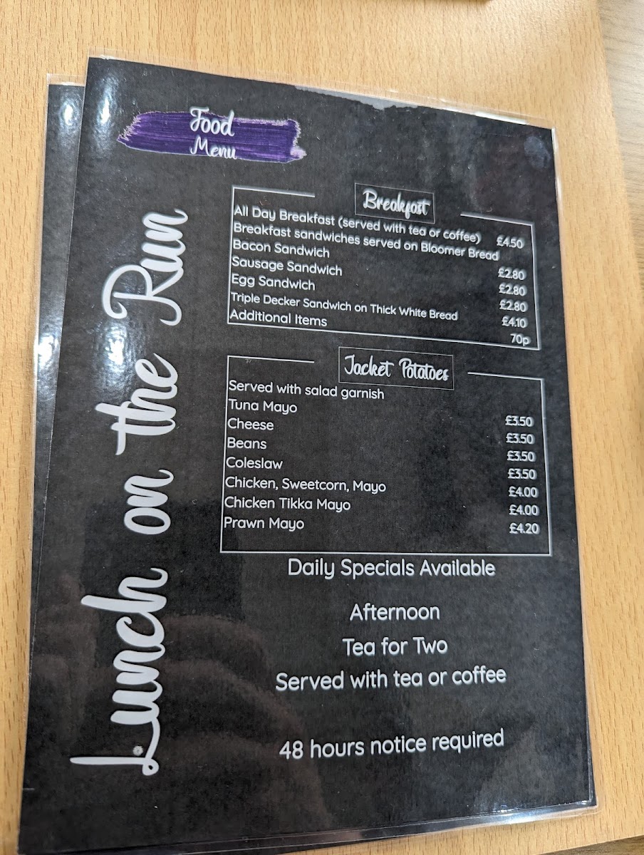 - Jacket Potatoes: Various toppings are available including Tuna Mayo, Cheese, Beans, Coleslaw, Chicken with Sweetcorn and Mayo, Chicken Tikka Mayo, and Prawn Mayo.